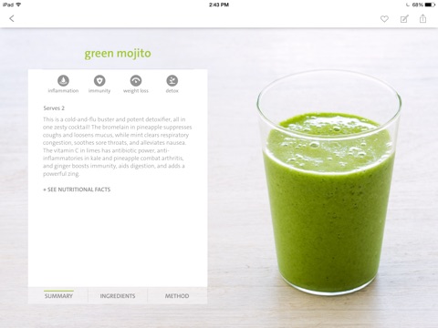 I wasn’t a fan of smoothies, until this app. I love the little tool to find the best smoothie, although most often I just browse through all the recipes. I still cannot get over the wide range of tastes and colours thought of by The Blender Girl. My problem now is, every recipe I try ends up in my Favorites!