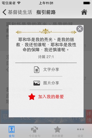 同时,您亦可透过「今日金句」的功能,每天简短地带出一个金句信息,给我们这些忙碌的都市信徒,心里再默默思量神的话语,亦借着紧记和谨守神的话语,使灵命有根有基,生根建造。