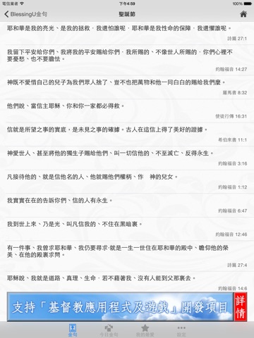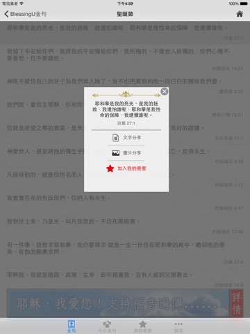 同時,您亦可透過「今日金句」的功能選項,每天簡短地帶出一個金句信息,在心裡默默思量神的話語,亦藉著緊記和謹守神的話語,使靈命有根有基,生根建造。