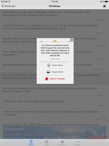 "BlessingU Bible Scripture" is our first mobile App which empowers you to create vivacious eCards spontaneously with aspiration of your daily devotion verses. Besides it is an agile and comprehensive tool in your personal daily devotion with GOD, it also pretty handy for your care-giving with friends and public sharing on different social platforms and media.