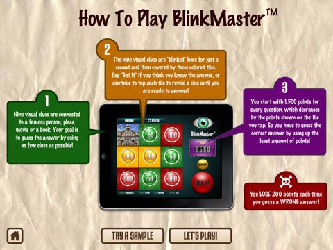 BlinkMaster is a challenging game that tests your instincts and your memory. Use the visual clues that are "Blinked" on the screen to figure out the connection. Just dont use too many! Each clue costs you valuable points! Can you figure out what famous person, place or thing the clues point to before you run out of points? Click "...More" to learn why you should download this App today!