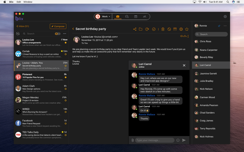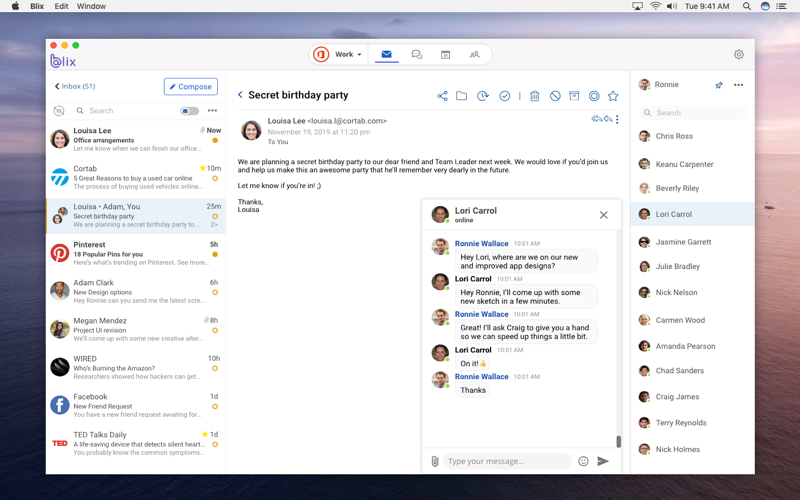 Blix is the ultimate communication tool for you and your team. It combines email, chat, later board, calendar, contacts and more in one single app. Using multiple apps plus email to communicate with your team is tiresome and frustrating. Blix makes managing your team’s collaboration easy, simple, and affordable by organizing it all into one innovative app.