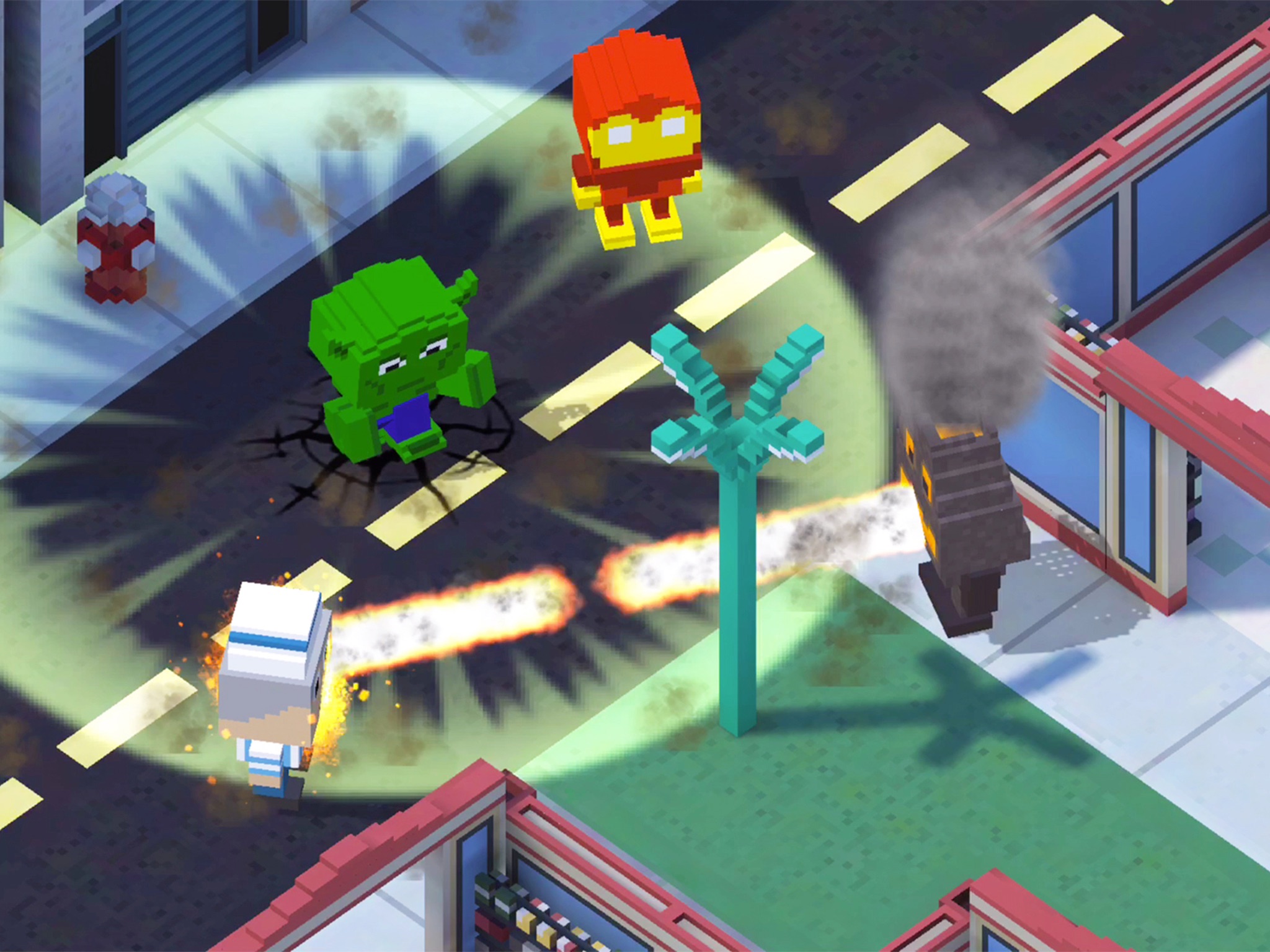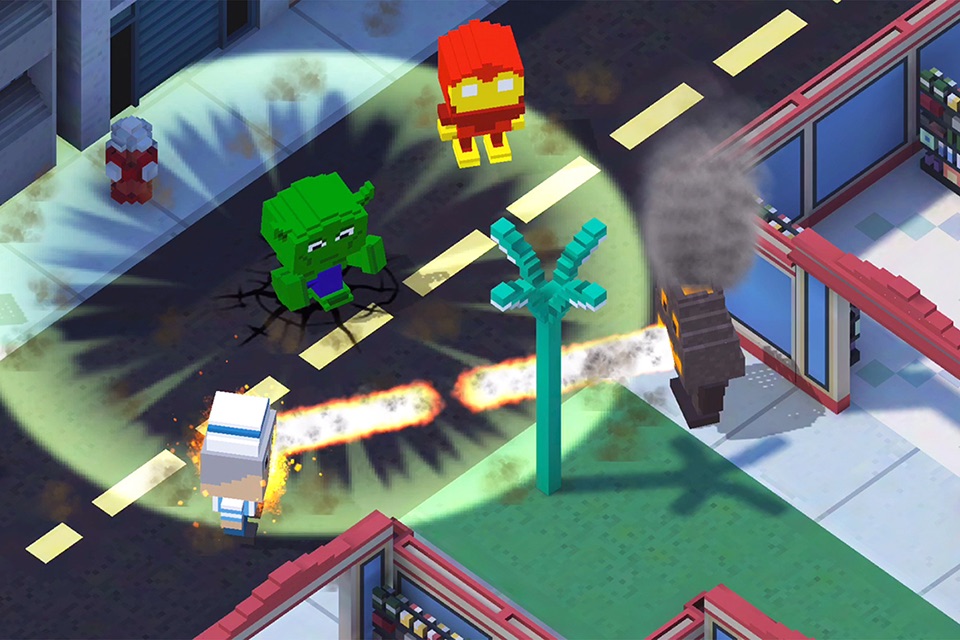 Got nimble thumbs? Block Battles: Heroes at War gives all the power to the player. You move and shoot freely about the map. No auto-aim. No click-to-move. Just you and your ability to dominate the match. Run and gun or head for cover while waiting for your health to regenerate. Then jump from the black of the shadows, unleash your characters super power and force your score to the top. There are a variety of power ups each with it’s own ability to turn the tides of battle. There are 3 maps included with the initial release of the game: Pixel City, Iron Space Station, and Apocalypse Temple. Additional maps will be added with each update.