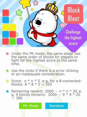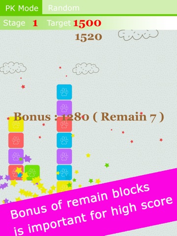 The game has a PK Mode and a Random Mode. Under the PK mode, the same stage has the same order of block, and it is available for multiple people to play in the same stage at the same time to see who will get the the highest score.