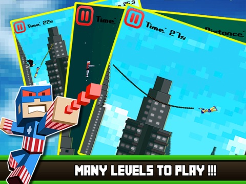 Use your ropes to swing Heroes from one skyscraper to another. You have full control over your ropes, touch on a building to throw your rope there, touch again to release it and fly through the sky. Then land on the Red Target to finish the level. Lots of different power ups to help you get past that tough level.