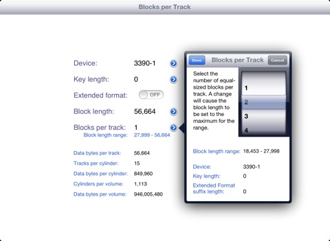 Calculate how many blocks of a given size will fit on a DASD track. Or calculate the range of block sizes given the number of blocks per track. Supports all historical and modern mainframe DASD CKD devices from the 2305 through the 3390-1T. Choose the key length and if the blocks are Extended Format. Easier to use than all those paper reference summaries!