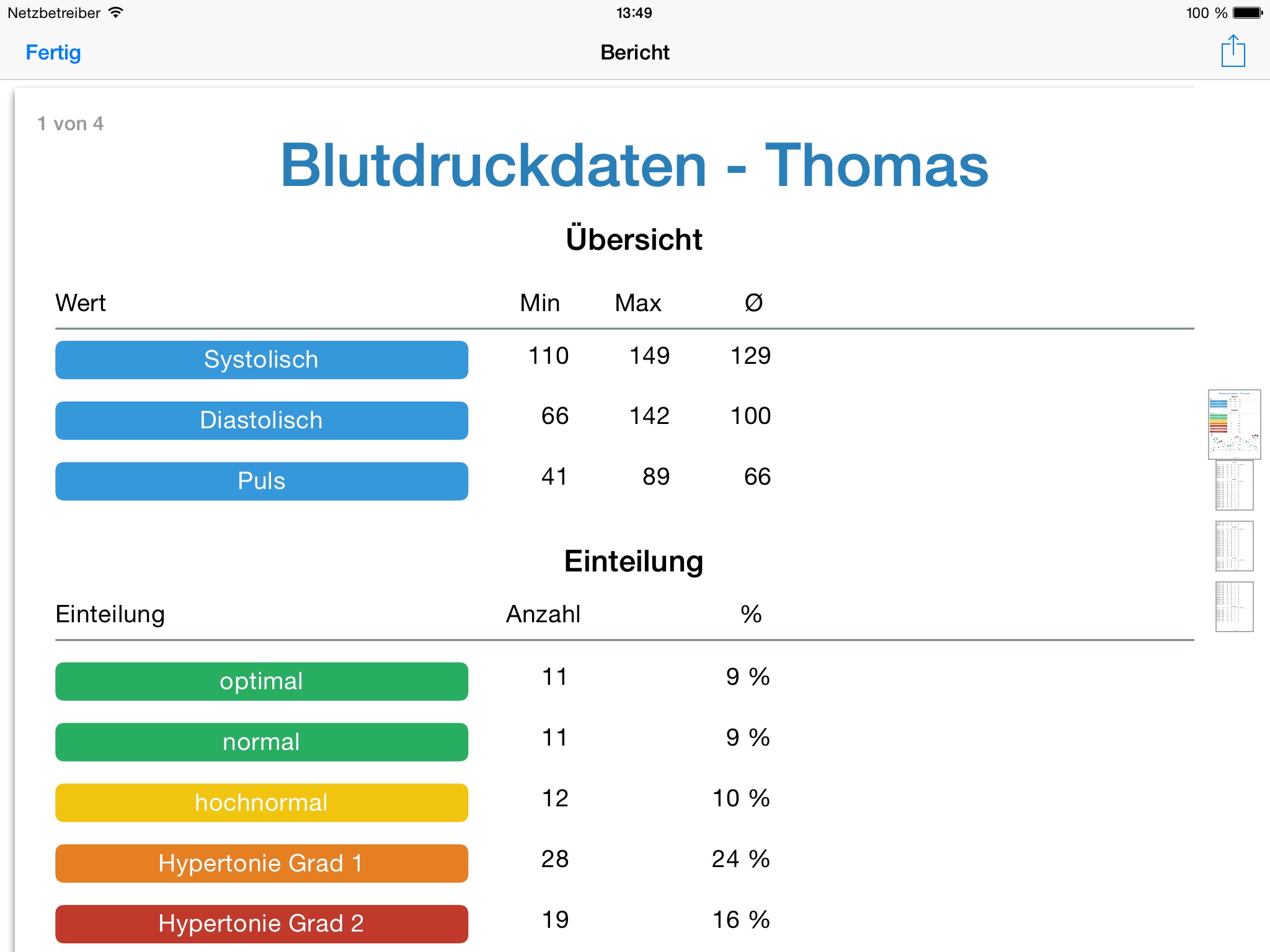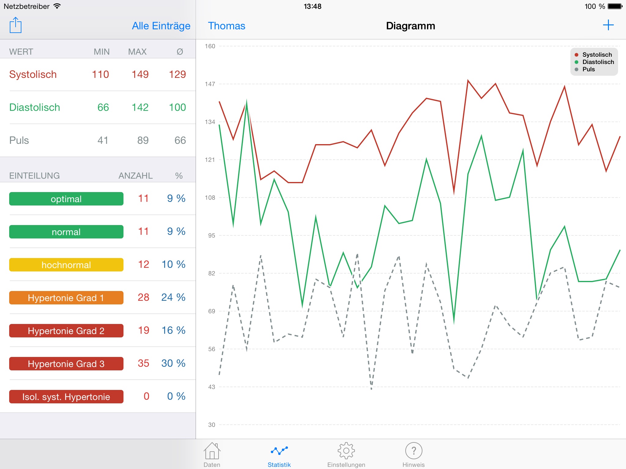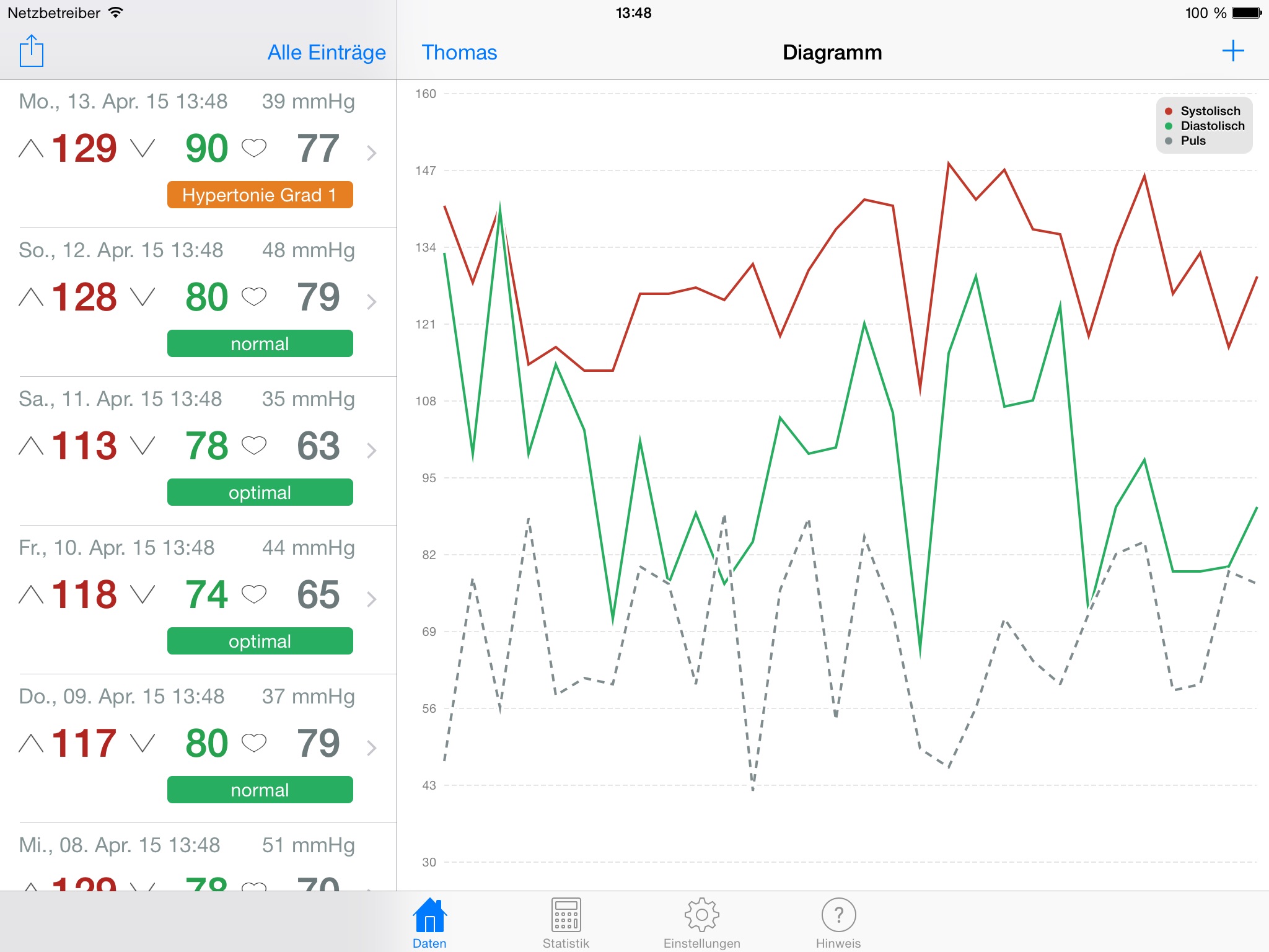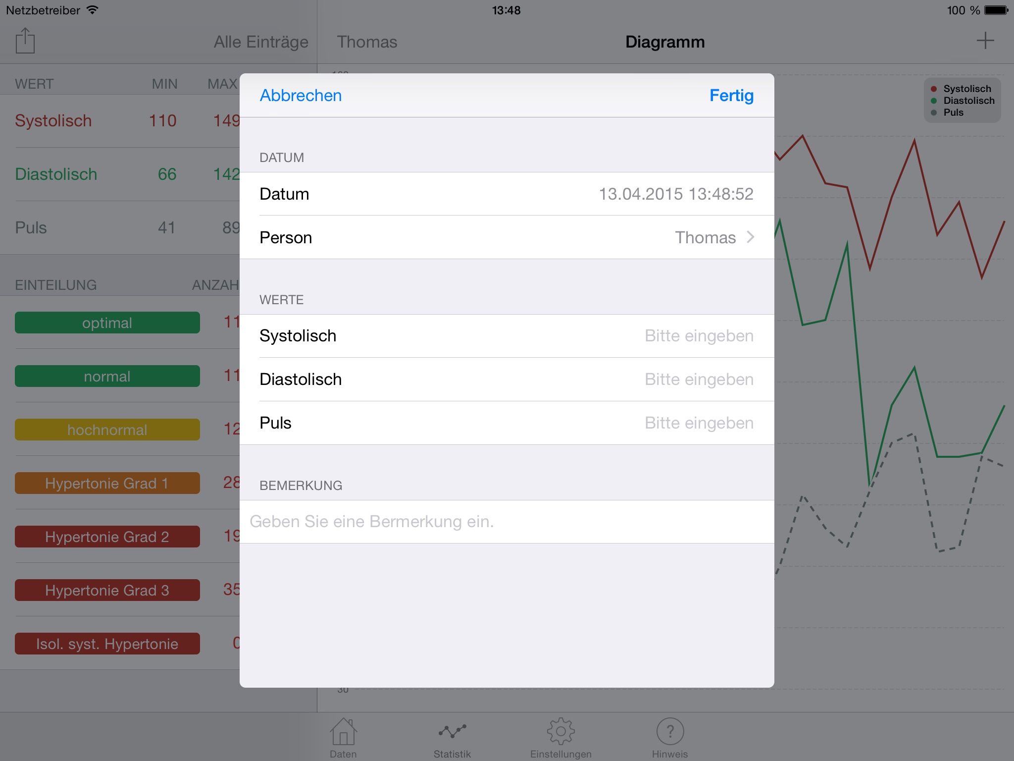 Fast and simple capturing of your blood pressure and pulse readings. Automatic classification into different warning categories according to the WHO.