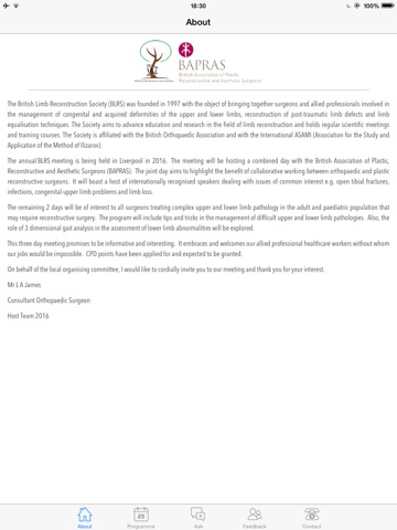 BLRS 2016 is the official app for the British Limb Reconstruction society annual meeting to be held in Liverpool form 16th till 18th of March.