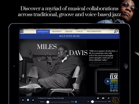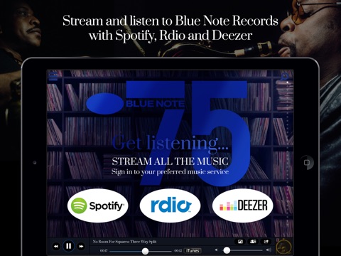 Download this free app to explore Blue Note Record’s extensive repertoire of all forms of jazz music, album covers, stories, pictures and video. Spotify, Rdio and Deezer premium music subscribers can simply sign in to their preferred streaming services in-app to absorb an abundance of jazz. Thirty second audio clips and album purchase is also available courtesy of iTunes.