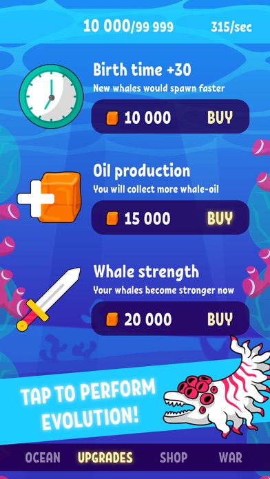 Use your powers to evolve ordinary whales into the strange mutant creatures! Tap fast to collect whale oil and use it to improve your whale beasts and your store! Mix your whales between each other and raise up it level!