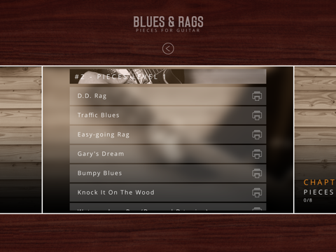 Blues & Rags is easy to navigate, so you can concentrate on your practice session instead of learning complicated controls. From the main screen, just pick a fingerstyle pattern or a piece to learn. You can also choose from several "Help" pages filled with useful explanations of the lessons. From the "TabView" screen, just listen to the practice piece until youre comfortable enough with it to start working on it. If you get confused, dont worry. Just tap the "?" button and easy to read graphics show you exactly what to do.