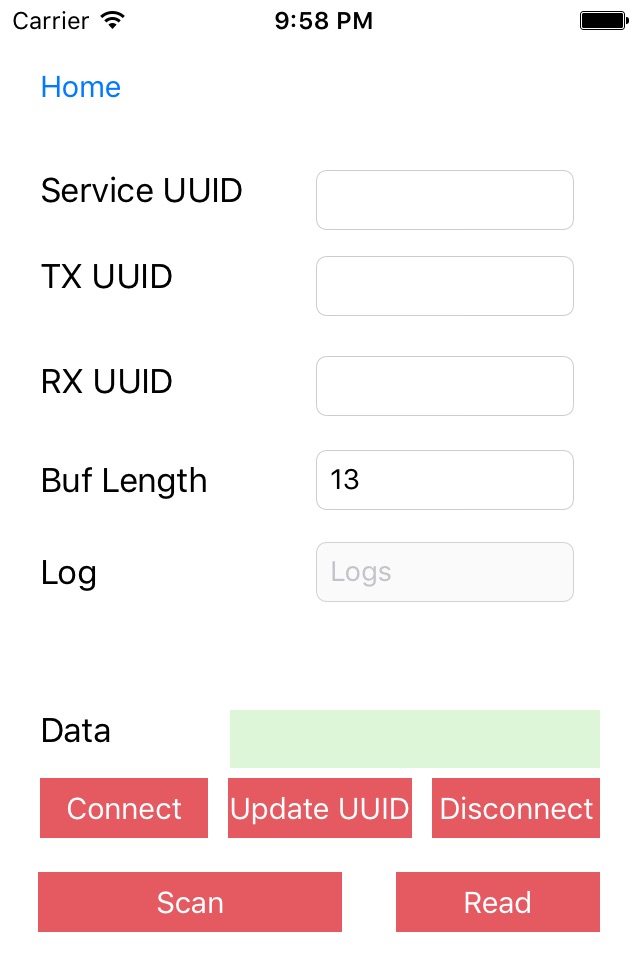 Heres a great tool for Bluetooth Developers to work with. The app works well with BLE chips such as nRF51822. You can define your own Service UUID, Char TX UUID and Char RX UUID to test connection and read information.