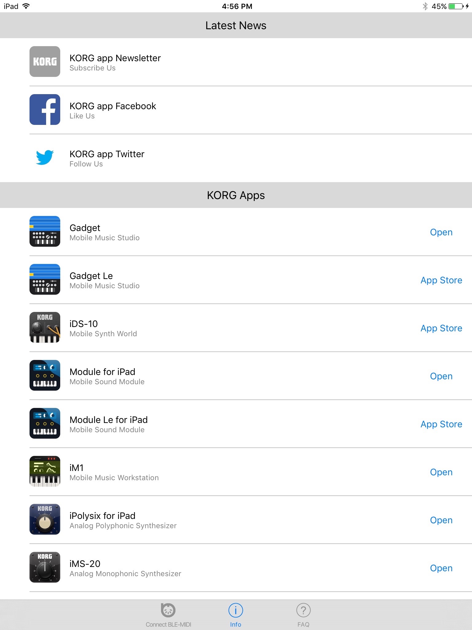 Korgs Bluetooth MIDI Connect allows you to easily connect Korgs Bluetooth MIDI compatible controllers such as microKEY Air, nanoKEY Studio, nanoKONTROL Studio wirelessly with your iPhone/iPad.