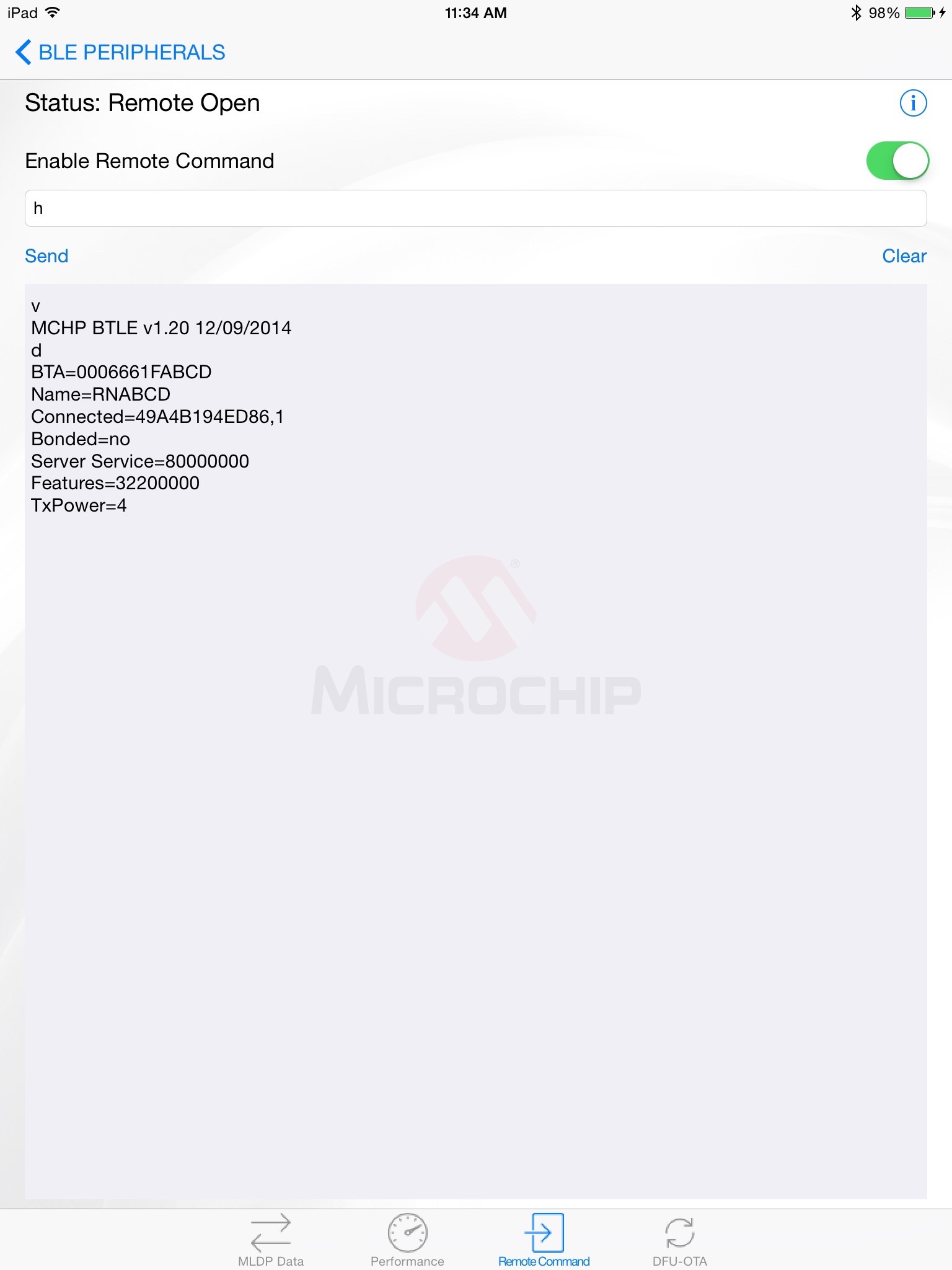 Microchip’s SmartData provides the ability to scan and connect to RN4020 Microchip Bluetooth Low Energy (BLE) peripherals with Microchip Low Energy Data Profile (MLDP). Once connected to a RN4020 Microchip BLE peripheral with MLDP, the MLDP tab lets user to transfer data back and forth between the device and BLE peripheral using a simple data terminal view. The performance tab can be used to stream and receive files to measure throughput. The remote command tab lets the user open and exercise a remote command session to configure the RN4020 module remotely. The DFU-OTA tab allows device firmware upgrades over-the-air on the RN4020 module. The help on each tab provides description and the commands that can be used to configure the RN4020.