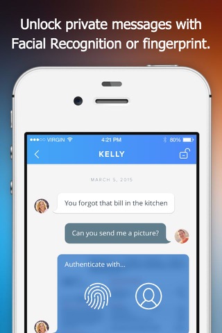 Send private chats that can only be opened after the receiver confirms their identity via facial recognition or touch id. Never wonder again if your sensitive text messages got in the wrong hands. You can also delete your messages off their phones just in case you change your mind about them having your pic or text. Its SUPER FUN and POWERFUL!