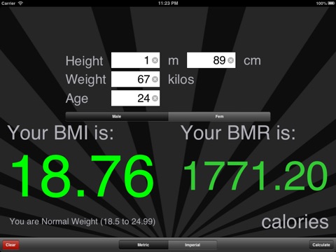 I took off one star for making me X out of an ad before even seeing the screen. I appreciate that its free and supported by ads but that was just overkill. That said, I really liked that it factored in my age and that there is a decimal point so my 5 ft 3.5 inch height wasnt a problem. It does the job (and tells me how many calories I burn just by staying in bed). No problems. I like it. PS: It works fine on my iPhone 6 plus with IOS 8.1.