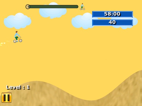 Speed up by touching the bike to make it heavy while moving downhill. In order to maximise your speed from sliding downhill, do not touch the bike when you are moving up. Remember you need to cover as much distance as you can in a limited time. Pick up bonuses along the way to help you complete each level.