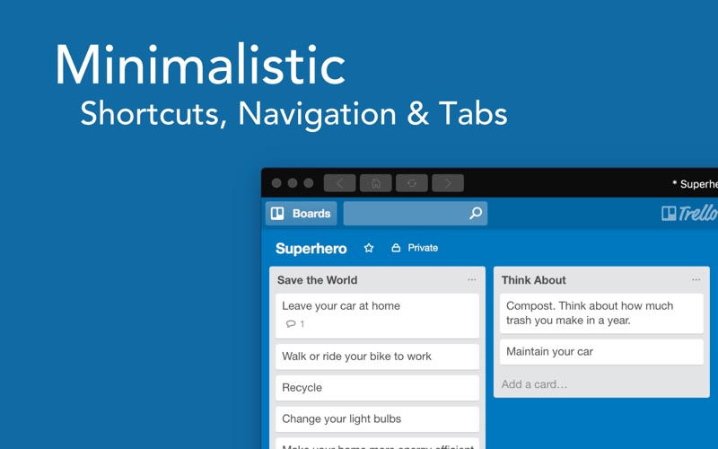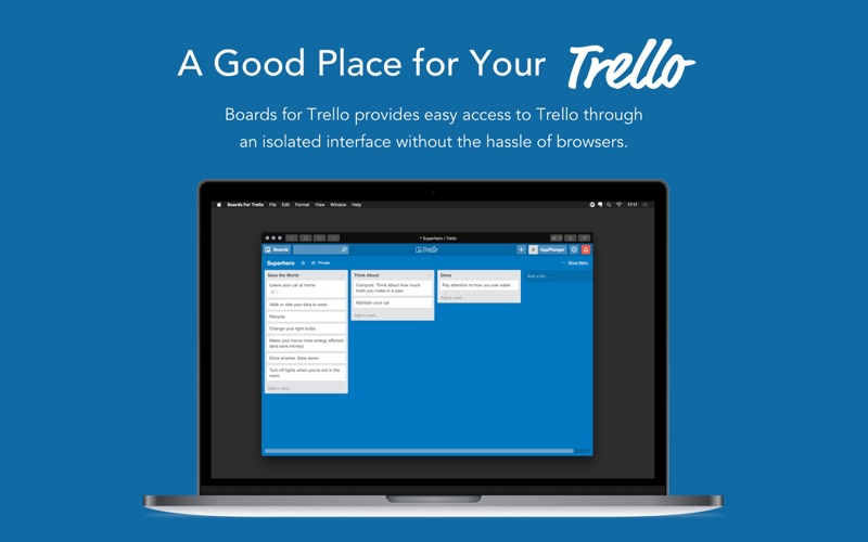 Boards for Trello provides easy access to Trello through an isolated interface without the hassle of browsers.