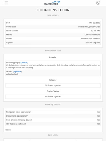 BoatSetter Today Mobile Check-out Check-in App allows boat owners and captains to streamline the boat rental process. Boatsetters handy app helps document boat inspections and record important data prior to departure within a easy to use interface.