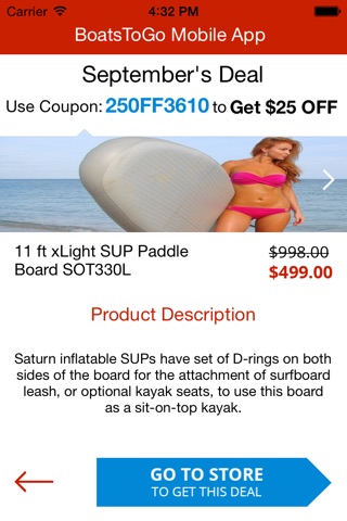 BoatsToGo is the leading Inflatable Paddle Boards Manufacturer since 1999. In additional to having our online store, www.BoatsToGo.com, this new BoatsToGo Mobile Application gives you exclusive deals and discounts on all our products. Again, these discounts are available only to our mobile app users. Thank you and Enjoy!