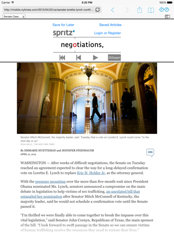 A browser and mobile safari extension that lets you speed read your favorite web content like NYTimes, HuffPo, ESPN, blogs, or any other web site. It is powered by Spritz technology. It is the best speed reading app for web content on iOS! Boba takes advantage of iOS8 action extensions, it lets you speed read content right in Safari! Look for the lightening glasses icon.