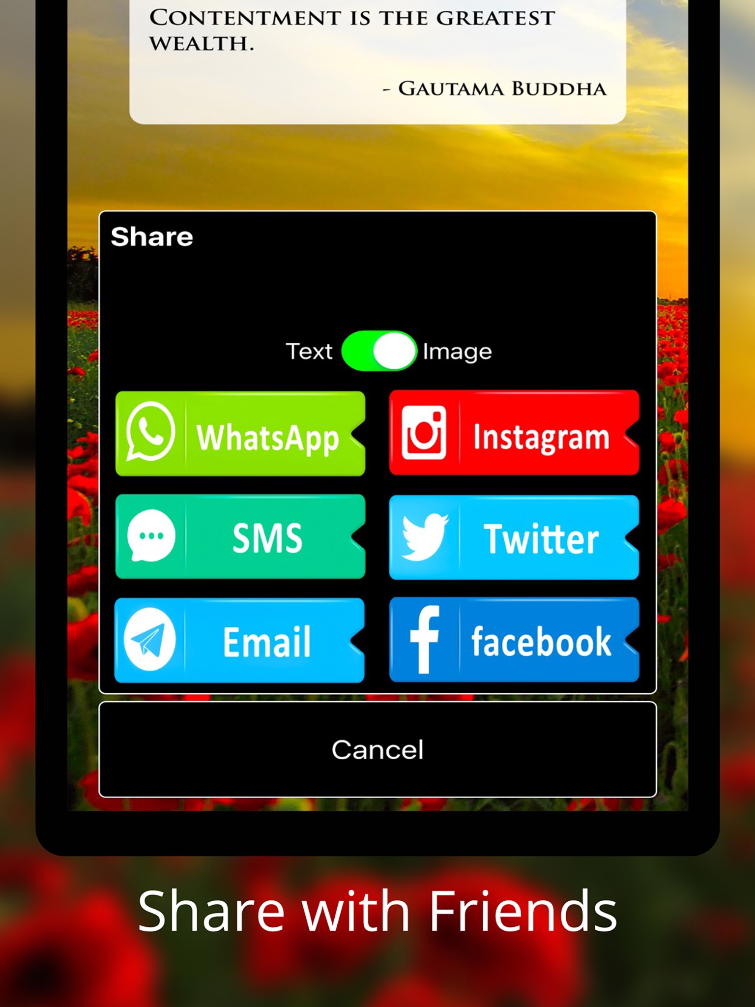 - Sharing with your friends has never been easier! This is the most sharable App on Buddhism, featuring share capabilities via, Facebook, Twitter, WhatsApp, Instagram and more!