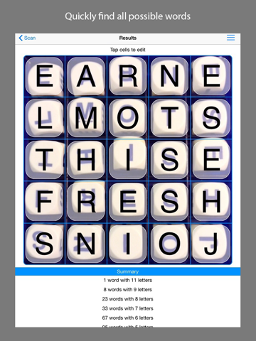 This app is the perfect utility for word-game enthusiasts who want to check for missed words or see how hard a board is before playing. Once a board is scanned, view a summary of all possible words in the board or search for a specific word. English, French, German, and Spanish dictionaries are available.