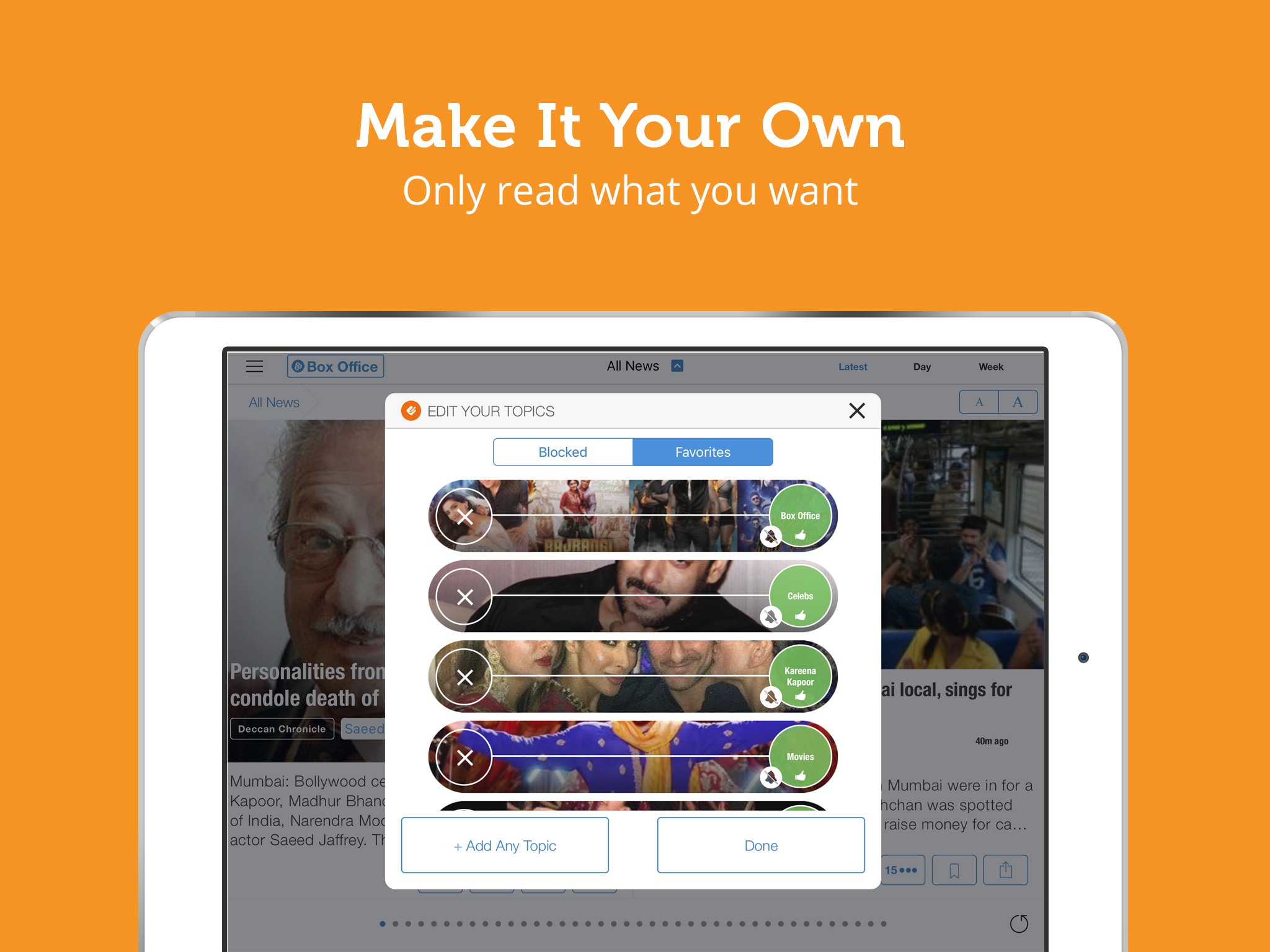 - Your very own news feed - choose the topics you want to follow or the topics you want blocked