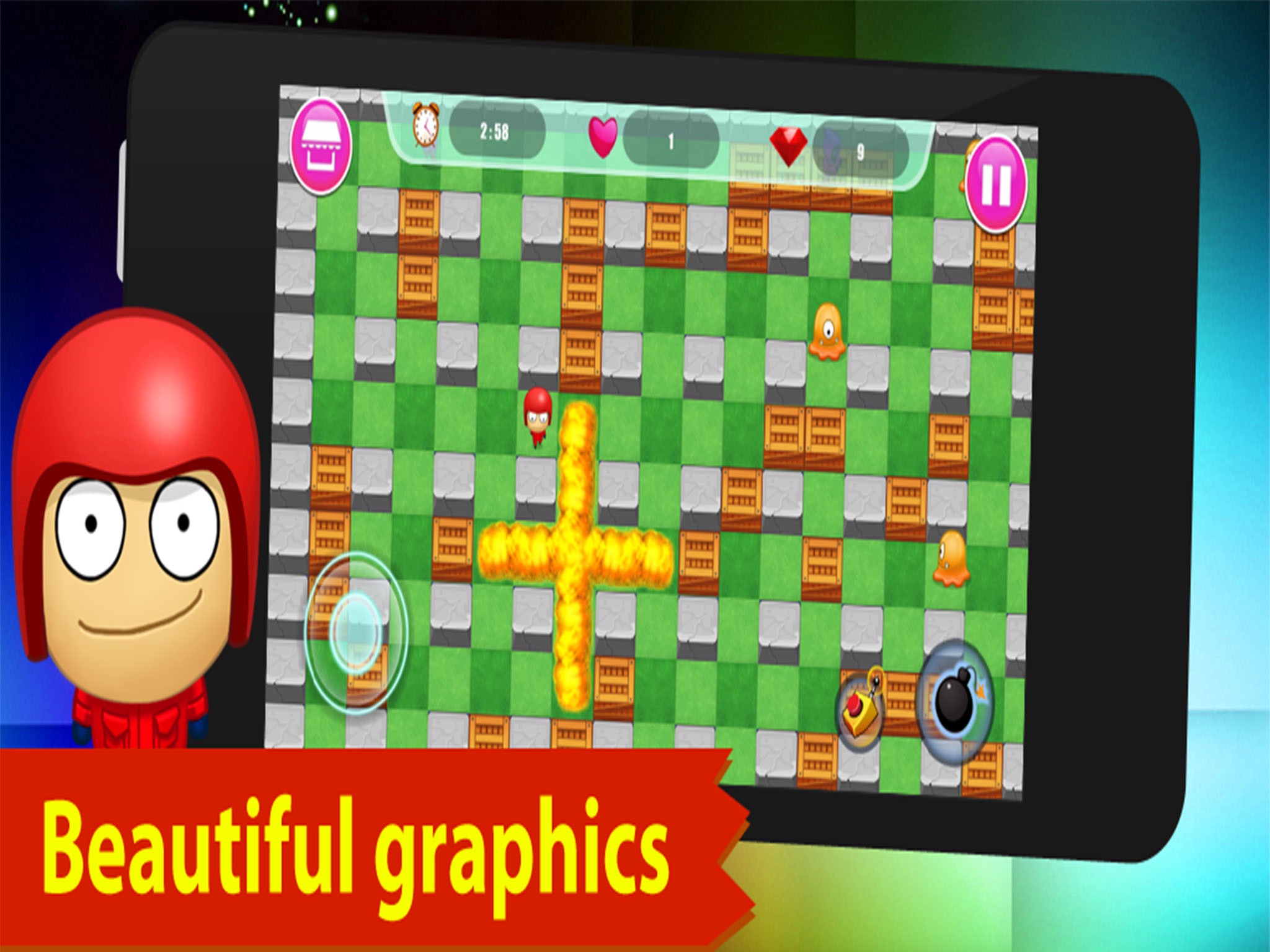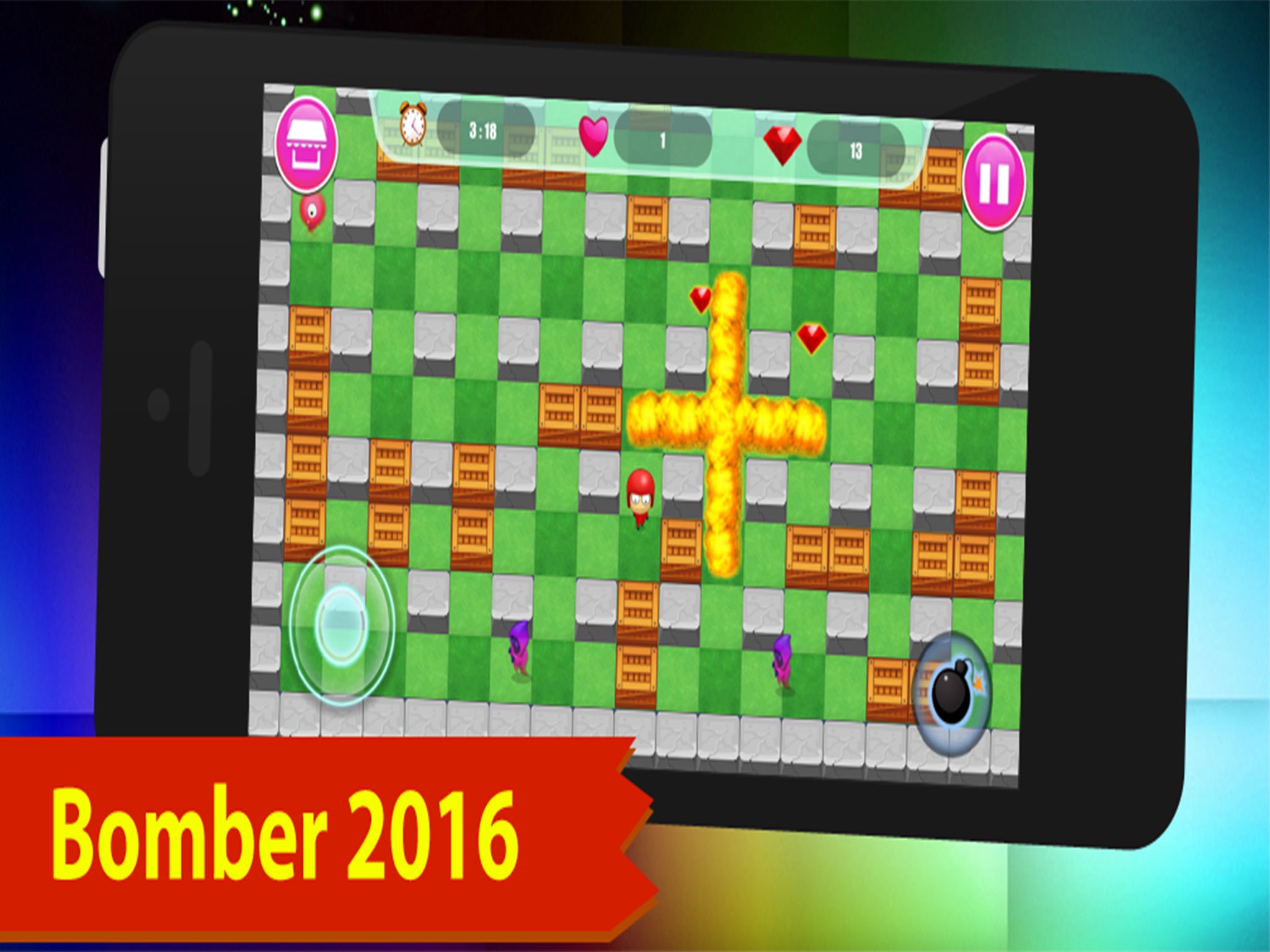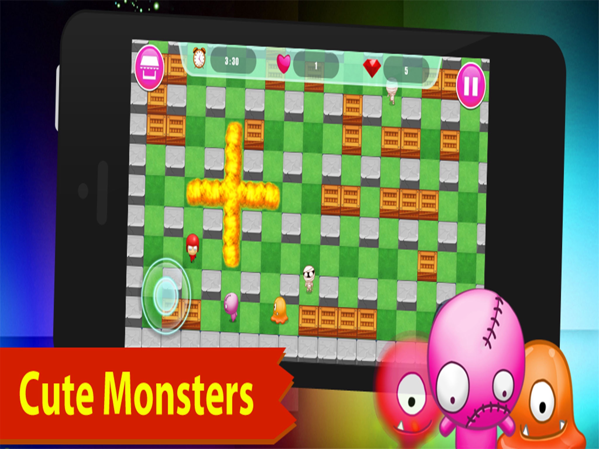 - Classic bomberman game play, with controls polished for touchscreen!