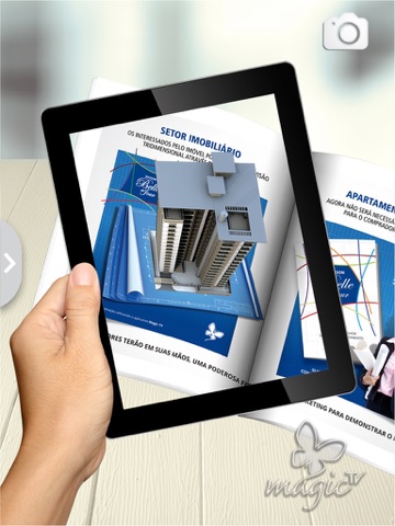 2) Com o aplicativo aberto, posicione a tela do seu smartphone ou tablet sobre as páginas* do portfólio da Magic TV.