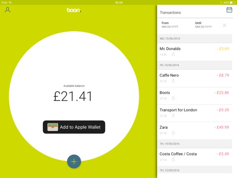 After you have registered, you can start paying with boon. in just a few short steps. Simply add your boon. digital prepaid Mastercard to Apple Pay. Top-up your account using credit or debit cards or via bank transfer. Hold your iPhone near the payment terminal with your finger on Touch ID or authenticate via Face ID. For paying with your Apple watch, double-click the side button on your Apple Watch and hold it near the reader.