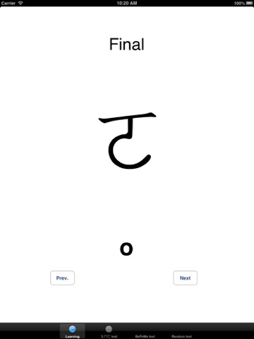 - 3 testes: one, where you have to pick the sound of bopomofo, one, where you have to pick a bopomofo character, and mix test, where the option is random