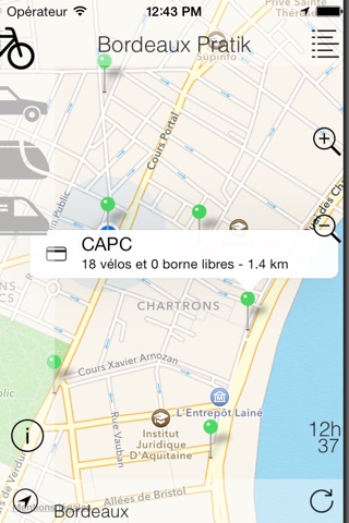 Just get the availabilty of Bordeaux Bicycle-sharing System (VCub), parkings and the nexts Tramway or Bus.