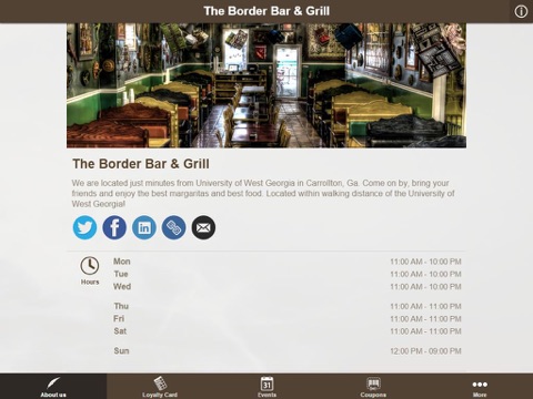 Your essential information on The Border Bar & Grill, directions, phone number, COUPONS, event LOYALTY PROGRAMS, stay up to date with Facebook and Twitter.