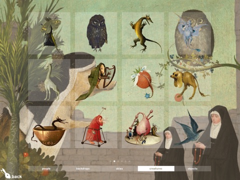 Choose from 249 HR details taken from his paintings, neatly divided in 5 taxonomies: people, backdrops, skies, creatures and objects.