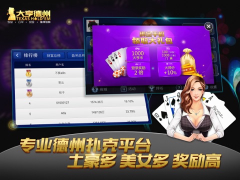 声明:本款游戏《大亨德州扑克》所涉及的任何活动及奖品与苹果公司无关,本款游戏内的道具“大亨币”不能用于其他任何应用,其他应用的道具或收益同样也无法用于本款游戏,特此说明。