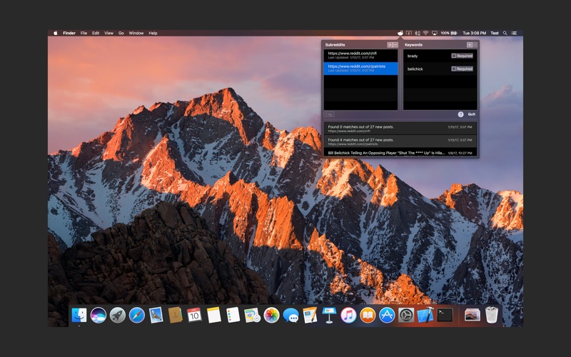 This menu bar app allows you to search reddit.com subreddits for posts based on keywords, automatically, in the background. The app alerts you when it finds a matching post.