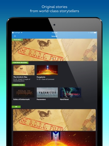 “Bound is shooting to fill the gap by building a home for top-shelf fiction on mobile. They are leveraging their experience in building gaming platforms to creating the most engaging and compelling experience possible for readers.” - best-selling thriller author, Eliot Peper