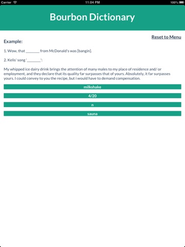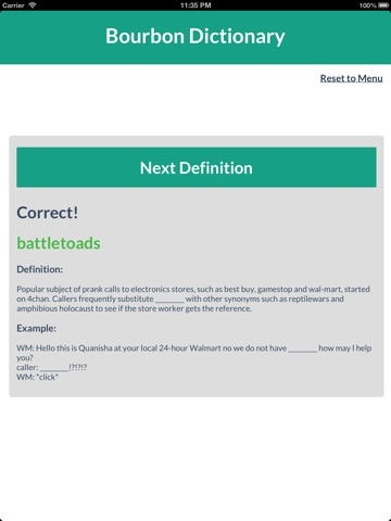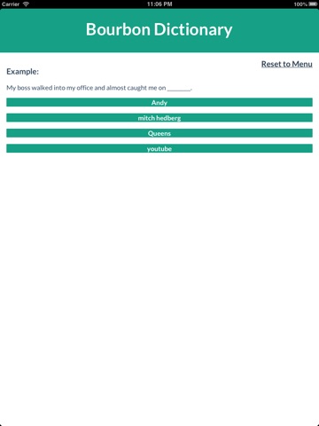 Bourbon Dictionary is a trivia game that pulls random definitions from urbandictionary.com, testing players with the definitions and example usage. You dont have to drink while you play... but it helps.