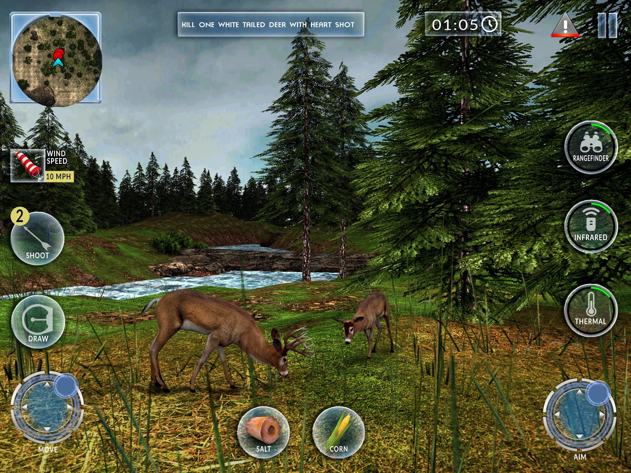 The deer in the simulation are easily spooked and will run quickly from the hunter if the hunter does not use the proper bow hunting techniques. The simulation contains over 200 hunts, with increasing difficulty, requiring better and better equipment, techniques, and hunting expertise.