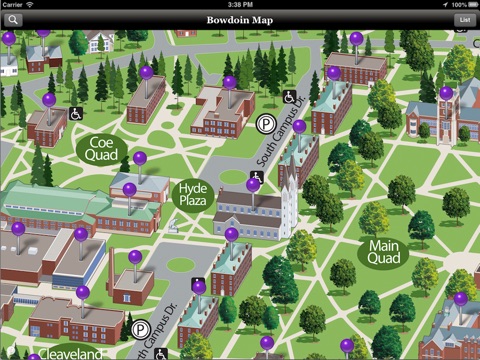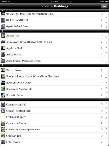 + List of Bowdoin buildings with names, pictures, and option to locate them on the map.
