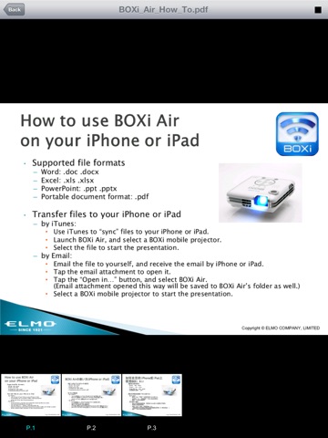 BOXi Air allows you to do hight quality wireless presentation directory from your iOS devices with the ELMO BOXi mobile projector, BOXi Air support Excel, PowerPoint, Word, and PDF files.