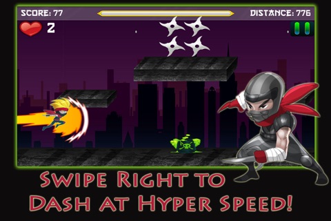 Run and jump your way across the city rooftops, collecting ninja stars and dashing through the air. Cover as much ground as you can, but beware of the Evil Ninja!