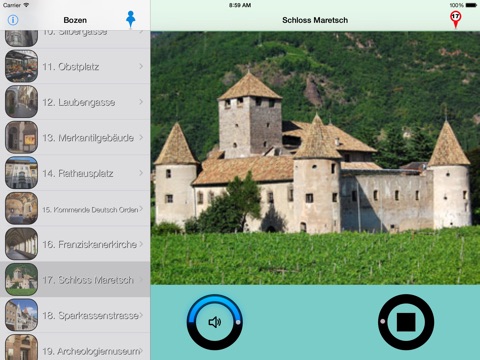 WICHTIG: wenn Sie in Bozen sind, können Sie das gratis WI-FI Netz der Stadt benutzen um die Audioführung herunter zu laden. Das Netz deckt die Gebiete um den Waltherplatz, den Universitätsplatz, die Talferpromenade und den Don-Bosco-Platz.