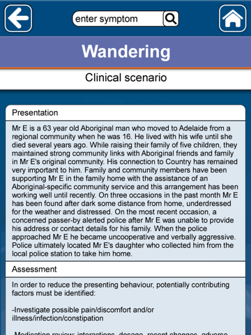 This App was developed to provide a quick reference guide which will assist clinicians in the field when they are presented with behavioural and psychological symptoms of dementia (BPSD). This App is provided for general information only and does not claim to reflect all considerations. It is recommended that clinicians consult the unabridged document, Behaviour Management - A Guide to Good Practice: Managing Behavioural and Psychological Symptoms of Dementia (2012) for more detailed information. As with all guidelines, recommendations may not be appropriate for use in all circumstances.