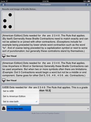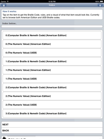 Having trouble recalling a Braille contraction or the use of a specific symbol? This is the App for you! This App contains access to a database of over 1,000 Braille symbols, contractions, and commonly misconstrued symbols. This App allows for the lookup of contracted (also known as Grade 2) Braille signs using the Unified English Braille (UEB) code. The UEB code was established as a new standard by the International Council on English Braille. This Braille code has been adopted by Australia, Canada, New Zealand, Nigeria, South Africa, the United Kingdom, and the United States. You can also lookup Grade 2 Braille symbols using the older English Braille American Edition, as established by the Braille Authority of North America (BANA). Some basic Computer Braille Symbols and Nemeth Code notations are also available via the lookup feature.