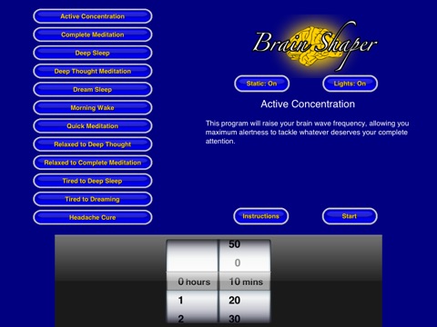 Complete Meditation - This program will take you from the average waking frequency all the way to the low delta frequencies to take you away from it all. Once at the bottom of the frequency range the program will present you with blue light, scientifically proven to react with your circadian rhythm to help keep you awake. This will allow you full control of your mind as you journey through this relaxing state.