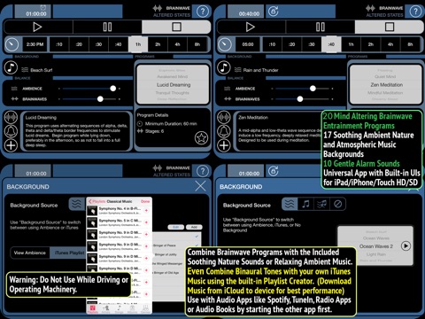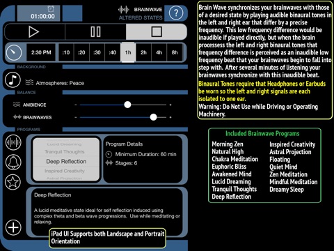 Meiner Meinung nach eine der besten ! Umfasst alle moeglichen ( mir bekannten ) Varianten an Bewusstseinszuständen und sehr viele hinterhrundklaenge. Zu jedem Klang gibt es eine genauer Information , Laufzeit ist Super einstellbar wobei sich die unterschiedlichen Phasen direkt an diese anpassen. Kinderleicht zu bedienen :)! Hab mir vom Entwickler direkt auch die app " 30 binaural Beats "geholt Top ! Zu der Wirksamkeit kann ich auch nichts sagen, dieses würde hier aber sowieso nicht reingehoeren. Die binaural Beats hat sich schliesschlich nicht der app Entwickler ausgedacht .