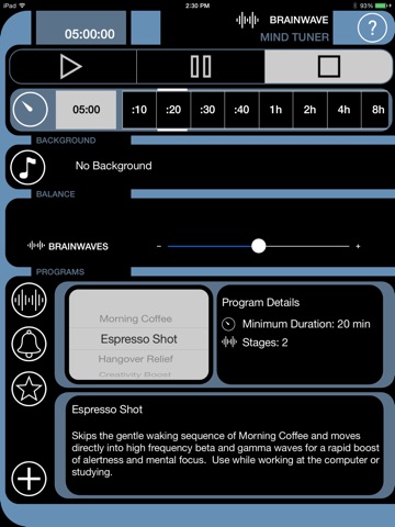 - Adjustable Brainwave Intensity - The intensity of the brainwaves can be adjusted independently of the ambient background sound. The application will also save your preference for future use.