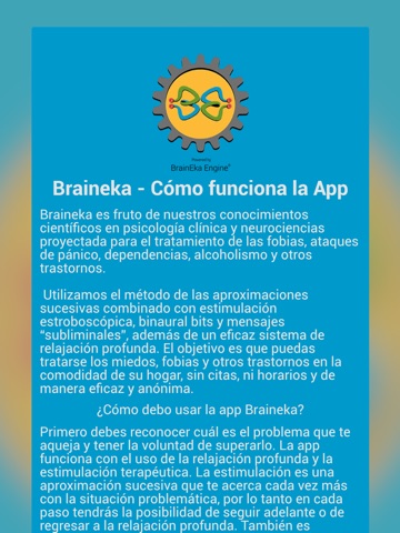 Braineka es una aplicación para dispositivos inteligentes desarrollada por el equipo de Alquímica Quimérica C.A. para tratar eficazmente los miedos, las fobias a diferentes estímulos o situaciones como volar, los insectos, los espacios abiertos, las alturas, los exámenes y otros. También tratamos otras condiciones como desórdenes alimentarios, alcoholismo, juego patológico, ADHD, depresión e insomnio. Nuestro objetivo es ayudarte a superarlos rápidamente y en la tranquilidad de tu hogar. Si necesitas más ayuda profesional puedes dirigirte a nuestro equipo de psychologists.guru y solicitar una cita.